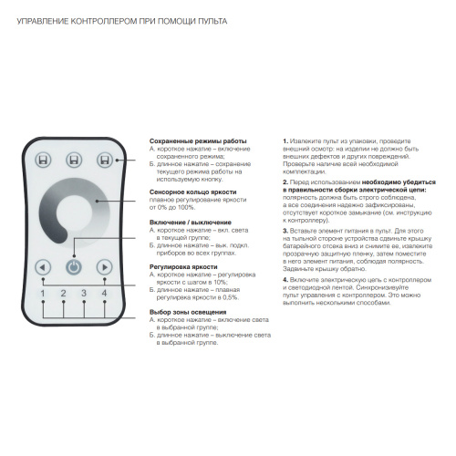 Применение данной модели пульта обусловлено распределением подключаемых светодиодных лент по группам, в которых требуется раздельное управление (до 4-х групп подключения с раздельным управлением).