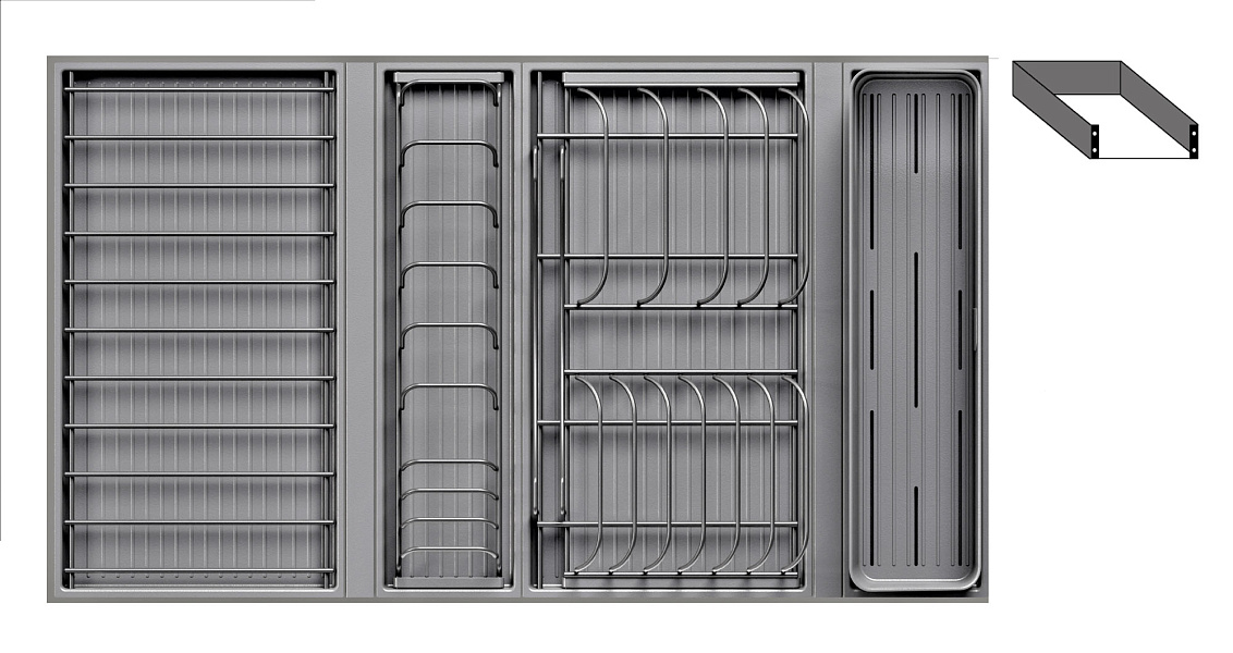 Модель — 1 большой модуль для посуды + 1 большой модуль с решеткой + 1 малый модуль для посуды + модуль для столовых приборов