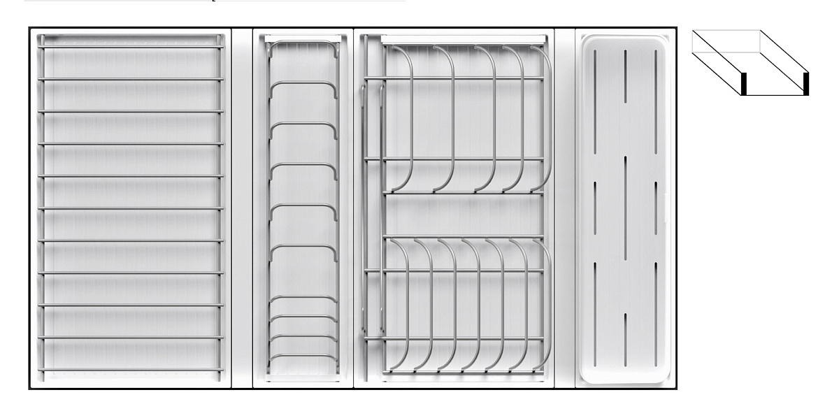 - 1 большой модуль для посуды + 1 малый модуль с решеткой + модуль для столовых приборов