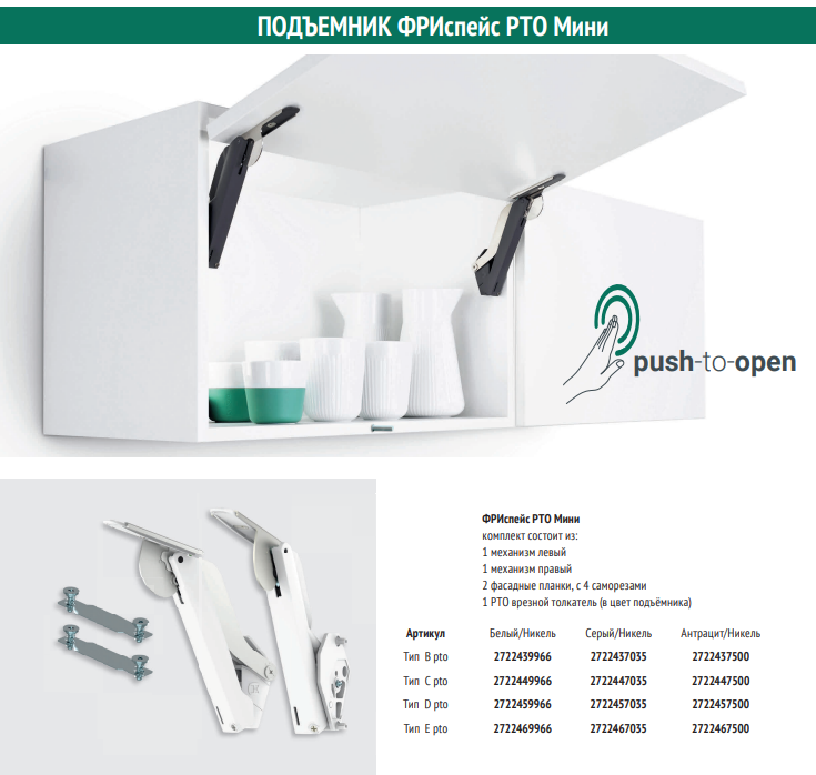 Подъемник ФриСпейс PtO, тип E, Комплект из 2 шт (правый и левый) и 2 крепления к фасаду, цвет СЕРЫЙ/никель (2722467035)