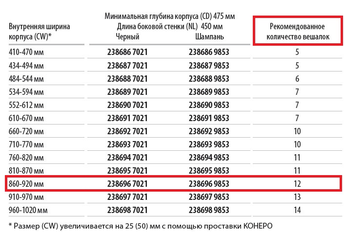 Размер (CW) увеличивается на 25 (50) мм с помощью проставки КОНЕРО