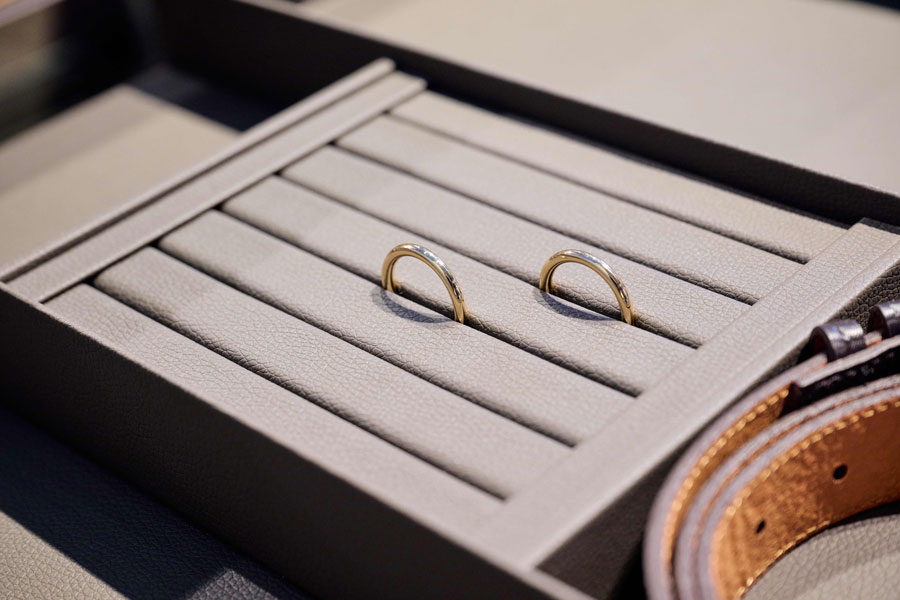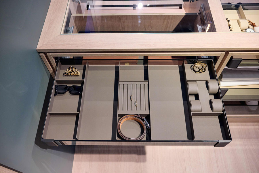 Кожаные вставки для выдвижных ящиков. Вкладыши из флока для ящиков и полок Conero будут дополнены новинками из искусственной кожи. Вкладыши универсальные, для ремней, часов, колец будут представлены в двух цветах - песочный бежевый и коричневая норка. Мягкая поверхность защищает аксессуары от царапин и повреждений. В зависимости от ширины ящика вкладыши могут быть скомбинированы друг с другом, вы создадите свое уникальное пространство для хранения ваших аксессуаров.